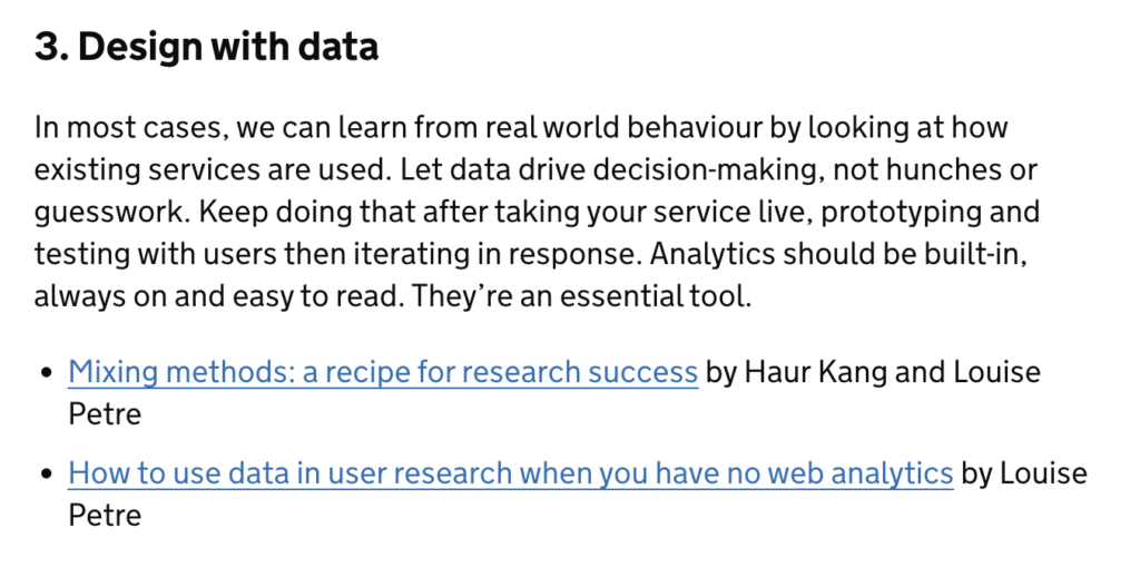 英國在「利用數據進行設計 – Design with data」延伸出兩個內部連結,更詳細的說明具體的實踐方法。