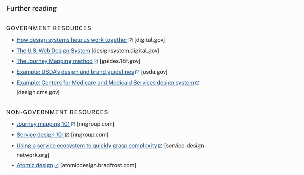 這種描述方式認識到,設計準則的文字說明總有長度限制。為了提供更全面、更深入的指導,政府會策略性地在準則頁面中嵌入豐富的超連結,導引設計師和開發者進入更專業的研究文獻、工具資源或相關部落格文章。關鍵特點包含: