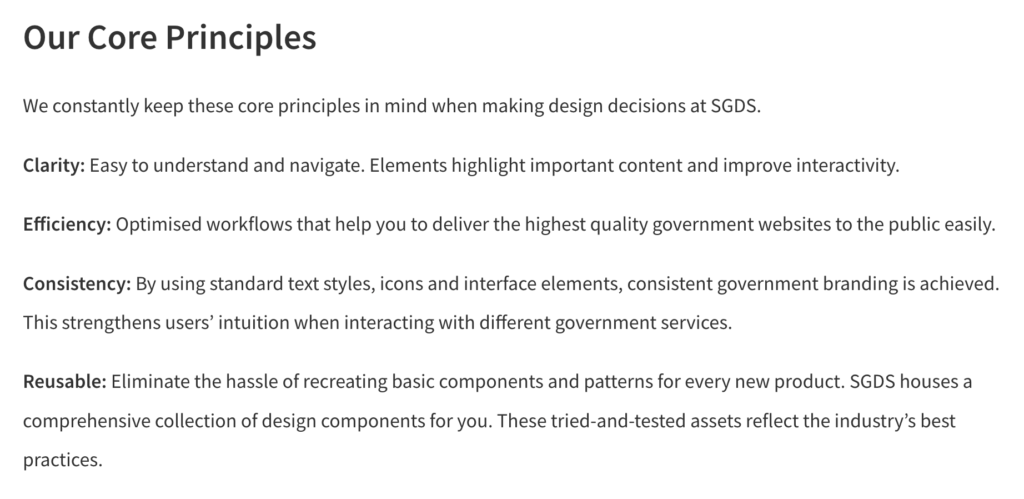 新加坡政府的設計準則中,對於核心原則的描述就是典型的標語式。它用極少的文字,清晰地定義了原則所追求的目標:這個描述並未告訴設計師如何實現,而是直接定義了清晰度看起來或感覺起來的樣子(易於理解、改善互動性)。