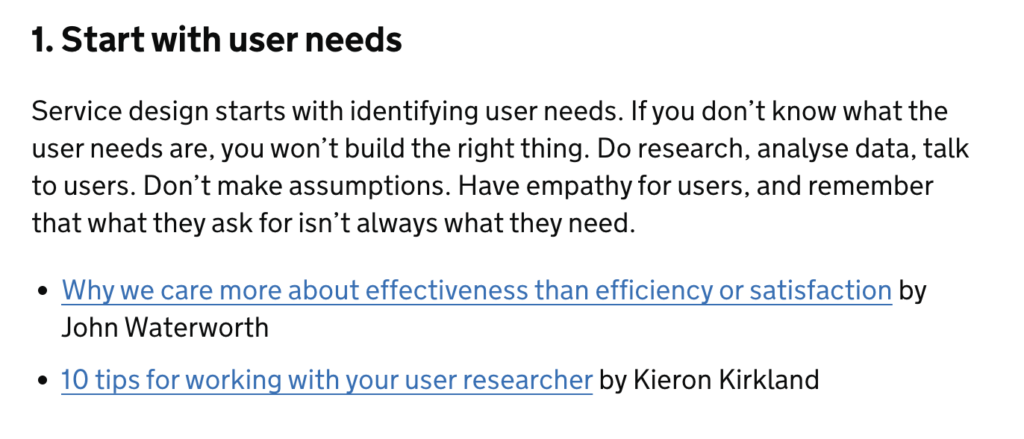英國數位政府的設計原則以清晰、以使用者為中心的敘事而聞名。從他們著名的「從使用者需求開始」(Start with user needs)為例,它們用一段話闡述了原則的哲學依據和基本要求: