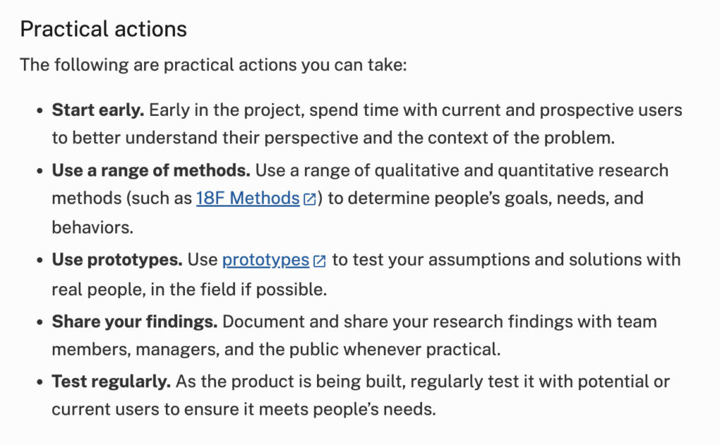 美國政府數位服務設計系統(USWDS)在其原則頁面,經常會搭配「問題思考」之後提供「實踐行動」(Practical Actions),每一個實際習動都以強烈的動詞(提早開始、使用、測試、分享)開頭,為團隊提供清晰的執行指南。