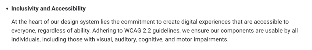 我們的設計系統核心承諾,是創造對每個人都可訪問的數位體驗,無論能力如何。遵循 WCAG 2.2 指南,我們確保所有元件都可供所有個體使用,包括有視覺、聽覺、認知和運動障礙的人士。