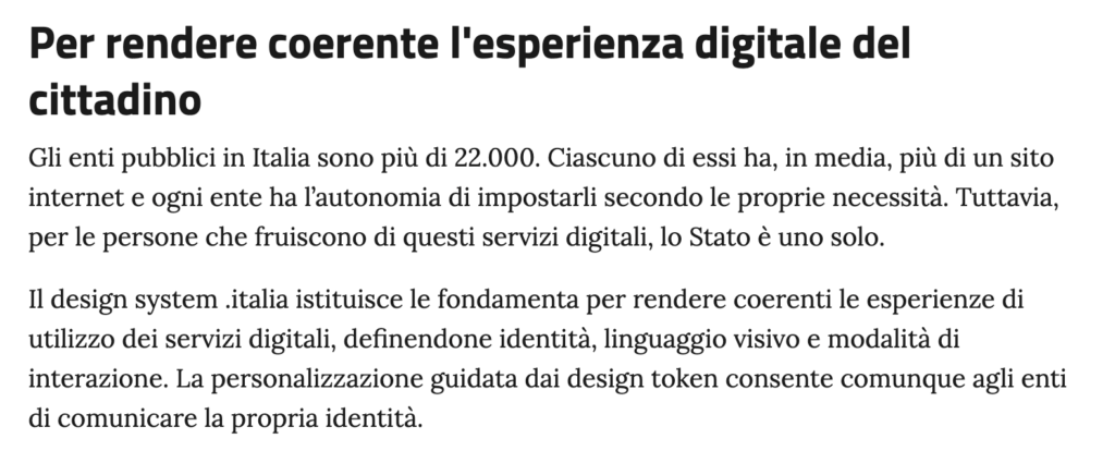 義大利有超過 22,000 個公共機構。平均而言,每個機構擁有不止一個網站,並且每個機構都有自主權根據自身需求進行設定。然而,對於使用這些數位服務的人來說,國家只有一個。 Design System Italia 建立了基礎,藉由定義其身份、視覺語言和互動模式,使數位服務的使用體驗保持連貫。透過設計代幣(Design Token)引導的個性化設置,仍然允許各機構傳達自身的身份。