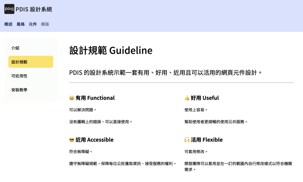 比較完各國數位政府的設計原則,我們現在可以來看看台灣數位政府現在的 PDIS 設計系統設計規範(Guideline)。